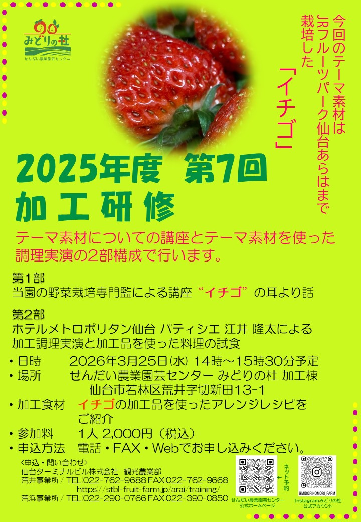 2025年度第7回の加工研修食材は「イチゴ」です。開催は、2026年3月25日(水)14時からです。