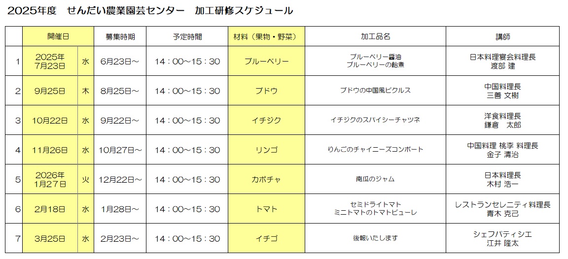 今年は、受講者の方々による実技は行わず、専門監による農産物に関する講座と、プロが目の前で行う加工調理の実技見学、加工品を使ったアレンジ料理のレシピ紹介と試食を予定しております。